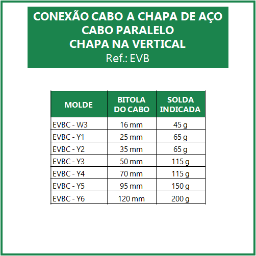 MOLDE PARA SOLDA EXOTÉRMICA CONEXÃO CABO A CHAPA DE AÇO – CABO PARALELO CHAPA NA VERTICAL (EVB)