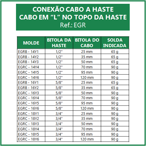 MOLDE PARA SOLDA EXOTÉRMICA CONEXÃO CABO A HASTE – CABO EM “L” NO TOPO DA HASTE (EGR)